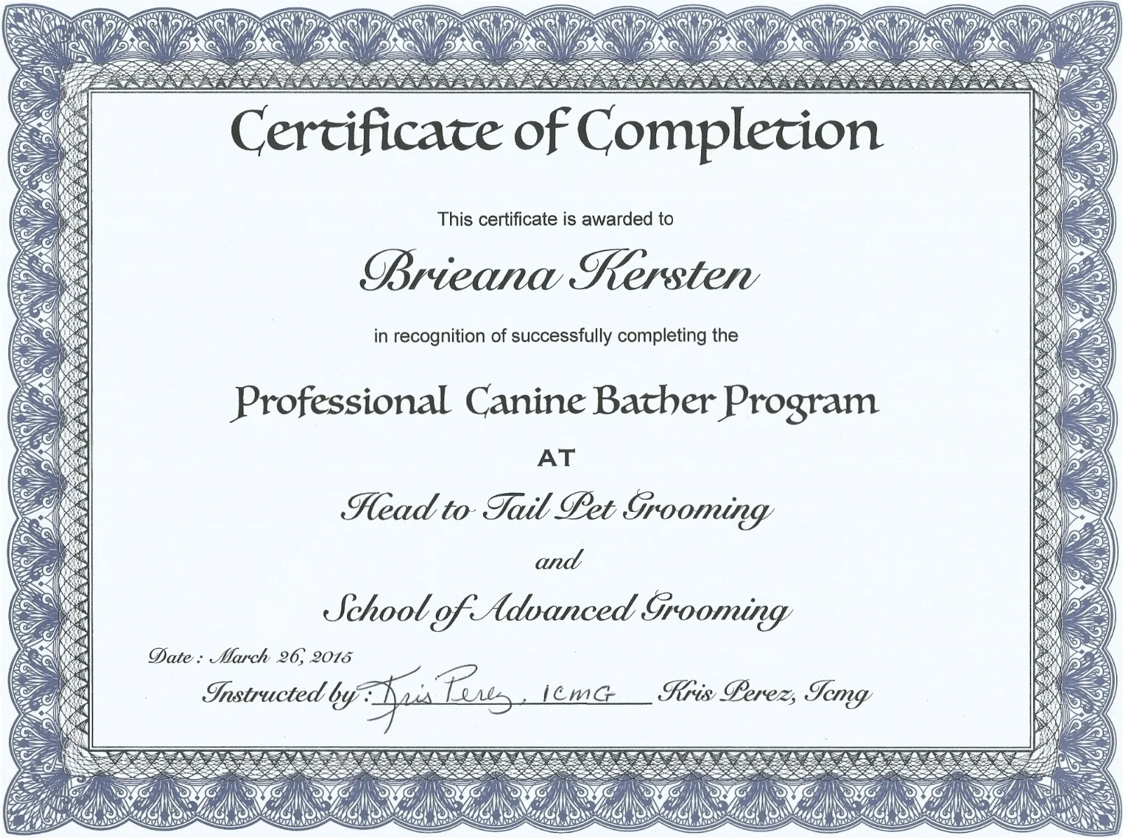 From there she wanted to extend her dog skills in every form, and learning how to professionally bathe dogs was an opportunity she was happy to explore. She obtained her certification through Kris at Head to Tail Grooming and IPG (International Pet Grooming) and washed pets returning home from Redlands Rover Ranch in downtown Redlands, CA. All the dog behavior knowledge helped wonderfully in assisting Brie to become a great bather.